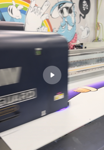 We operate all production in-house using a 5'×10' Vanguard UV flatbed, dual HP latex, Epson Eco-solvent roll printers, a Vanguard 10' roll-to-roll system, and a iECHO Flatbed cutter with CNC Router. No outsourcing.
